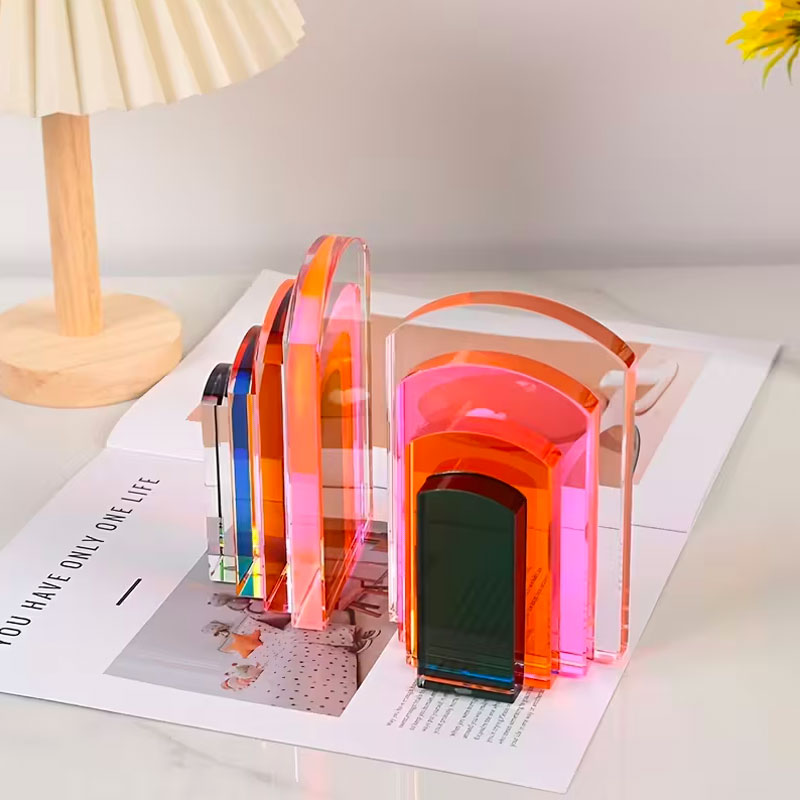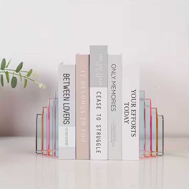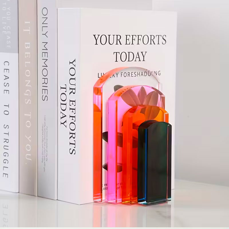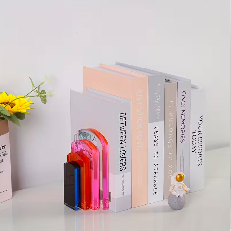 Support robuste et lourd en acrylique transparent, design en arche colorée pour maintenir vos livres bien en place. Antidérapant, il protège vos surfaces tout en ajoutant une touche décorative à votre bibliothèque ou bureau.