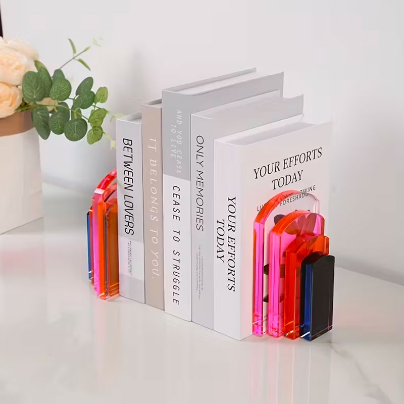 Support robuste et lourd en acrylique transparent, design en arche colorée pour maintenir vos livres bien en place. Antidérapant, il protège vos surfaces tout en ajoutant une touche décorative à votre bibliothèque ou bureau.