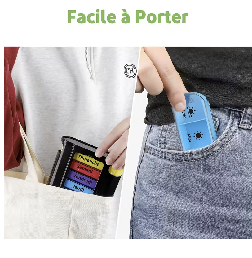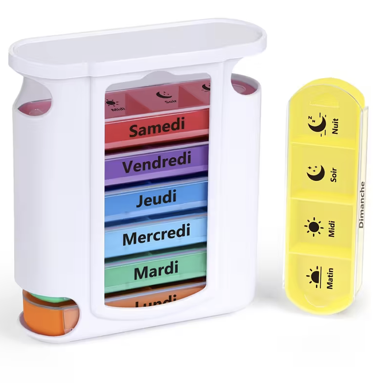 Dotée de 4 compartiments par jour (Matin – Déjeuner – Soir – Nuit), elle permet une gestion simple et sécurisée de vos prises quotidiennes.
