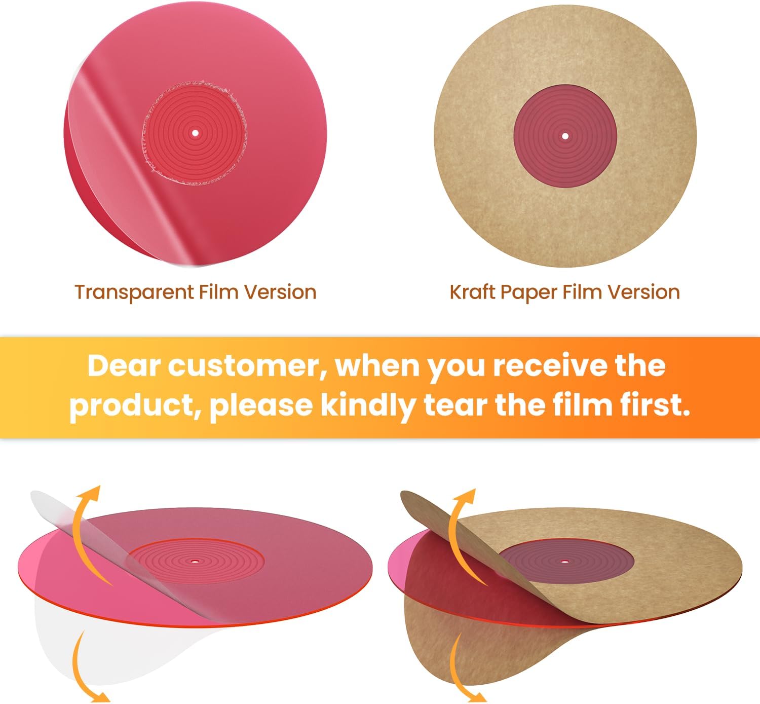 - Slipmat Record : pour garantir que les clients reçoivent des disques propres et lisses, nous avons introduit un film de protection en papier kraft serré des deux côtés. Cela évite les marques et les traces de doigts qui pourraient apparaître lors de l’emballage et de l’expédition.