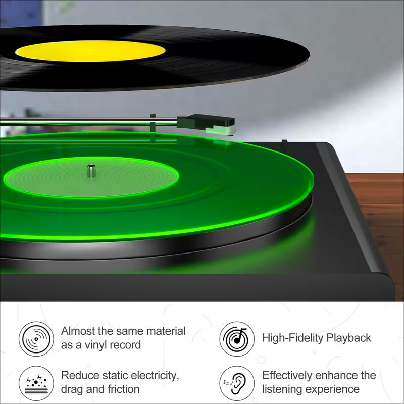 - Tapis antistatique pour platine vinyle à résonance amortie : ce tapis de disque permet au stylet de faire un meilleur contact avec le creux de l’étiquette du disque, obtenant une réponse des basses plus serrée et un fond de lecture plus silencieux par rapport au tapis traditionnel en liège ou en feutre