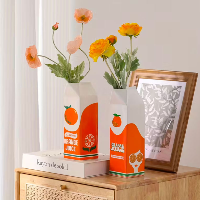 Ajoutez une touche fun et rétro à votre décoration avec ce vase en céramique style boîte de jus d’orange. Inspiré des briques de lait vintage, il arbore une étiquette réaliste pour un effet trompe-l’œil unique et tendance.